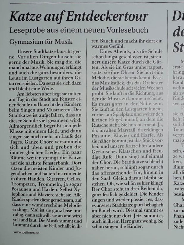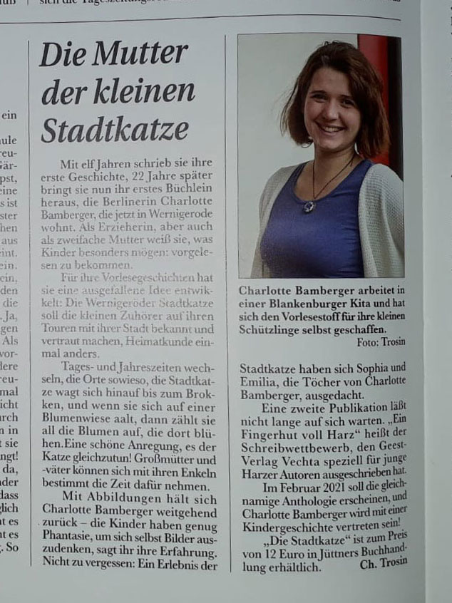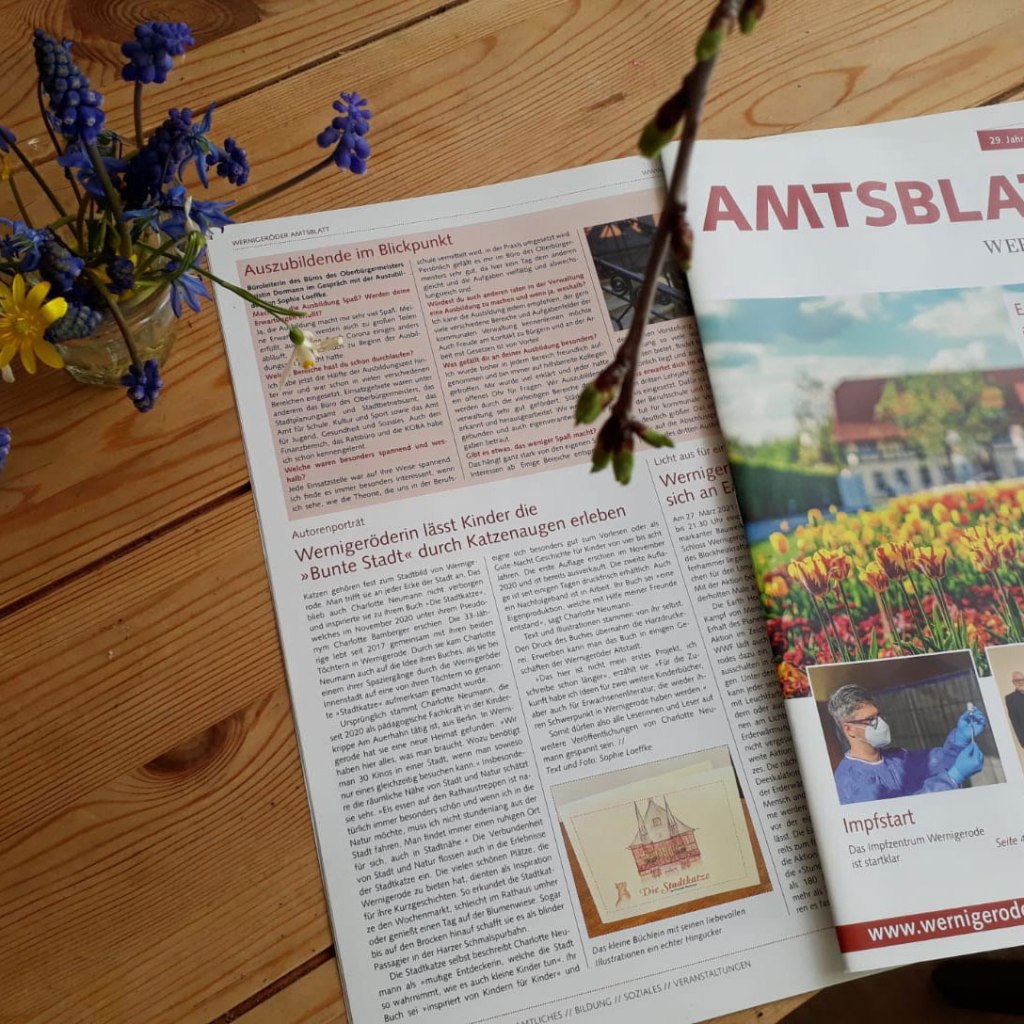 Volksstimme 20.04.2021 Auf den Spuren der Stadtkatze Amtsblatt Wernigerode Ausgabe 4/2021 Wernigeröderin lässt Kinder die „Bunte Stadt“ durch Katzenaugen erleben Neue Wernigeröder Zeitung 17.12.2020 Die Mutter der kleinen Stadtkatze & Katze auf Entdeckertour – Leseprobe Instagram